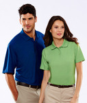 easy-care 100% polyester • 5-oz. • moisture-wicking • UPF 30 sun protection • shrink-and wrinkle-free • feminine silhouette • flat-knit collar • three-button placket with pearlized buttons • double-needle cuffs and bottom hem • side slits • tagless • Sizes: S-3XL