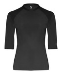 83% polyester/17% spandex moisture management fabric • 6 oz. • Stretch body fit--self fabric collar • Flatlock seam construction • double needle hem with tack • Badger heat seal logo on left sleeve. • Sizes: S-3XL.