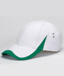 100% cotton • 6-panel mid-profile structured crown • contrast inserts on side panels • contrast wave color and under pre-curved visor • self-fabric sweatband • 2 stacked eyelets on side panels • contrast color self-adhesive closure with plastic pull tab • 4"w x 2"h imprint area • Sizes: one