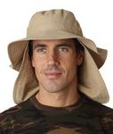 70% cotton/30% nylon • UV protective (UPF 45+) and water/stain-repellant coating • bucket style with neck cape • metal clip and cord system to attach to collar • Adams exclusive Cool-Crown™ mesh lining • CoolPlus® terry cloth sweatband • patented zipper pocket in the neck cape • Size: L-XL