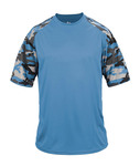 100% polyester • 3.5 oz. • moisture management/antimicrobial performance fabric • self-fabric collar • sublimated camo shoulder panels and sleeves • double-needle bottom hem • heat seal logo on left sleeve • Sizes: XS-XL