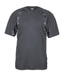 100% poly moisture management/anti microbial performance fabric • 3.5 oz • Sublimated static side and sleeve panel inserts • Self fabric collar • Double needle hem • Badger heat seal logo on left sleeve • Sizes: XS-XL