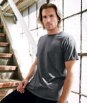 preshrunk 100% ring-spun cotton (blended preshrunk ring-spun cotton/polyester in heather colors) • 3.2 oz. • 40 singles • semi-fitted with side seams • 5/8” seamed collar • single-needle topstitched front neck • shoulder-to-shoulder taping • double-needle sleeve and bottom hems • tear-away label • Sizes: S-2XL
