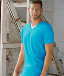 preshrunk 100% ring-spun cotton (blended preshrunk ring-spun cotton/polyester in heather colors) • 3.2 oz. • 40 singles • semi-fitted with side seams • seamed mitered v-neck collar • single-needle topstitched front neck • shoulder-to-shoulder taping • double-needle sleeve and bottom hems • tear-away label • Sizes: S-2XL